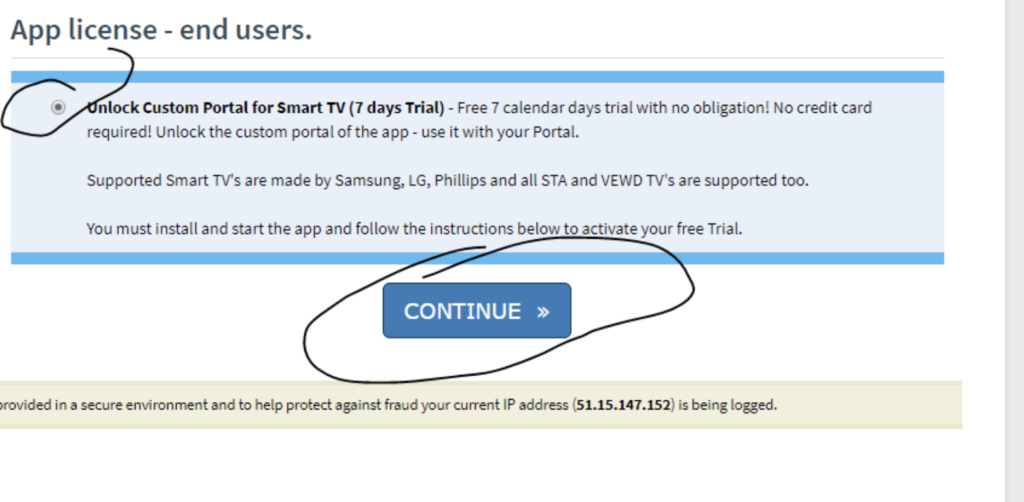 On the SMART STB site, pick Unlock Custom Portal for Smart TV (7-Day Trial), then go to the next step.
